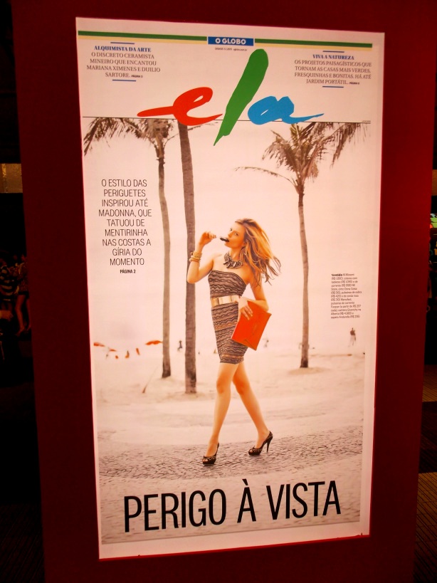 Totem no qual estava estampada capa de uma das edições do suplemento de moda do jornal O GLOBO Ela em que se tratava a respeito do estilo “periguete” de se vestir, que estava em exposição no Fashion Rio Verão 13/14, Marina da Glória.