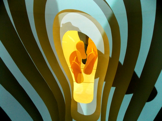 Um “close-up” do nicho onde se encontrava um par de sandálias amarelas Ipanema antecedido por linhas sinuosas com vários tons de cor “terra”, e que servia de decoração para o “stand” da marca no Fashion Rio Verão 13/14, Marina da Glória.