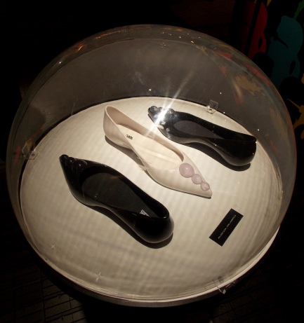 Modelos de calçados de coleção exclusiva assinada pelo estilista alemão Karl Lagerfeld para a marca brasileira Melissa, envoltos por redoma, e que ficaram à vista do público no Fashion Rio Verão 13/14, Marina da Glória.