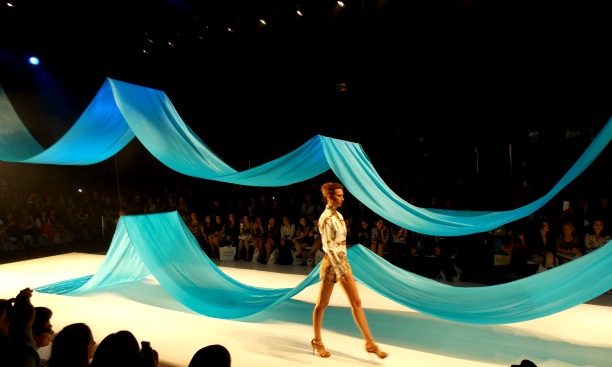 Nica Kessler exibe um conjunto de short e camisa com mangas compridas, ambos estampados, adequados à estação de verão, e sandálias vazadas com salto alto em seu desfile no Fashion Rio Verão 13/14 (Marina da Glória).