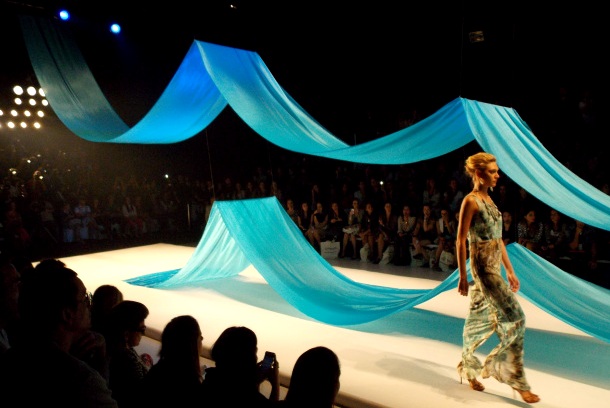 A fluidez da saia estampada com cintura alta, tendo a prevalência do verde, harmonizando-se com o top, foi uma das opções de Nica Kessler para a mulher se sentir confortável e elegante ao mesmo tempo no verão, em sua apresentação no Fashion Rio Verão 13/14 (Marina da Glória).
