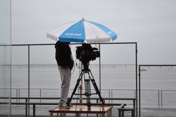 Em tarde bastante chuvosa, no primeiro dia do Fashion Rio, o cameran da Globosat (a maior operadora de TV por assinatura da América Latina e a líder de mercado no Brasil) se protege como pode, e registra os principais momentos do evento de moda dedicado à temporada outono inverno 2014, no Píer Mauá.