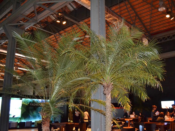Frondosas e verdejantes palmeiras serviam de ornamentação à área do restaurante Balneário Santa Fortuna, no Fashion Rio Outono Inverno 2014, no Píer Mauá.