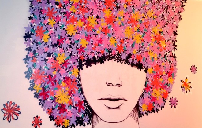 No stand da marca de calçados Melissa, logo na entrada principal, a pintura de uma mulher com os cabelos formados por coloridas flores, obra da artista plástica Di Couto, chamava a atenção dos convidados do Fashion Rio Outono Inverno 2014, no Píer Mauá.