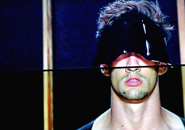 Um close-up do modelo no desfile de Victor Dzenk transmitido ao vivo no stand da eBay (empresa americana de comércio eletrônico, e que no evento de moda permitia aos convidados que usassem seus computadores com rede wi-fi gratuita, no Fashion Rio Outono Inverno 2014, realizado no Píer Mauá).