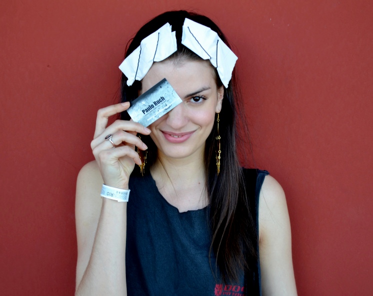 Uma linda modelo, ainda se preparando para o desfile do qual participaria, num gesto de elegância, exibe o cartão do meu Blog no momento em que registrei a sua imagem.