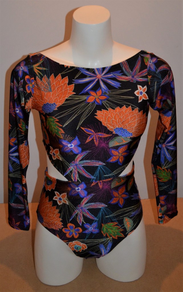 A imagem retrata um maiô cavado com mangas compridas e estamparia floral, numa clara referência aos trópicos e à estação estival.
