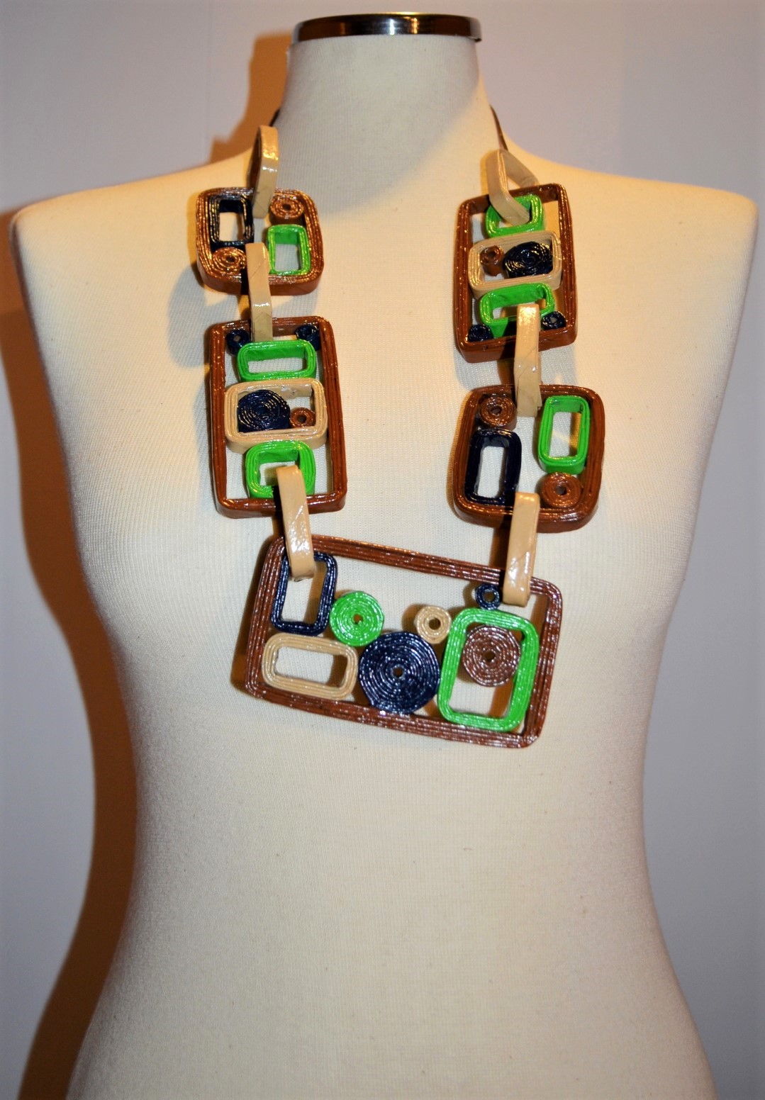 Uma das tendências de acessórios que se estabeleceram em definitivo na moda atual foram os maxi colares, como este à mostra no Coletivo Rio (um lounge montado no Fashion Rio, em sua temporada 2014/2015, no qual 30 marcas do Estado do Rio de Janeiro expuseram suas coleções), subdividido em peças pintadas com cores bem fortes, no caso o azul, o verde, o madeira e o creme ou bege.