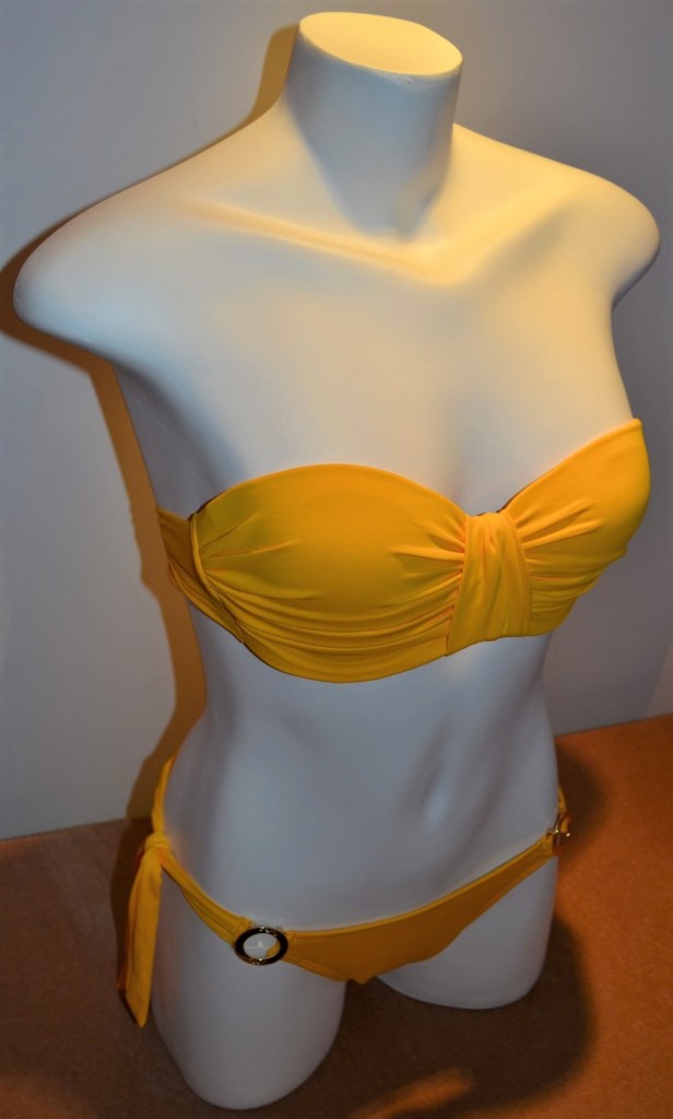 O amarelo é uma cor que se adapta naturalmente ao verão, e este biquíni não fugiu à regra, apostando na monocromia (a parte superior é drapeada e a inferior possui laços e fivelas), o qual pôde ser visto em uma das coleções das 30 marcas expositoras do Coletivo Rio, um espaço oferecido pelo Fashion Rio, na sua temporada 2014/2015, realizado na Marina da Glória, para a promoção de novas grifes e suas tendências.