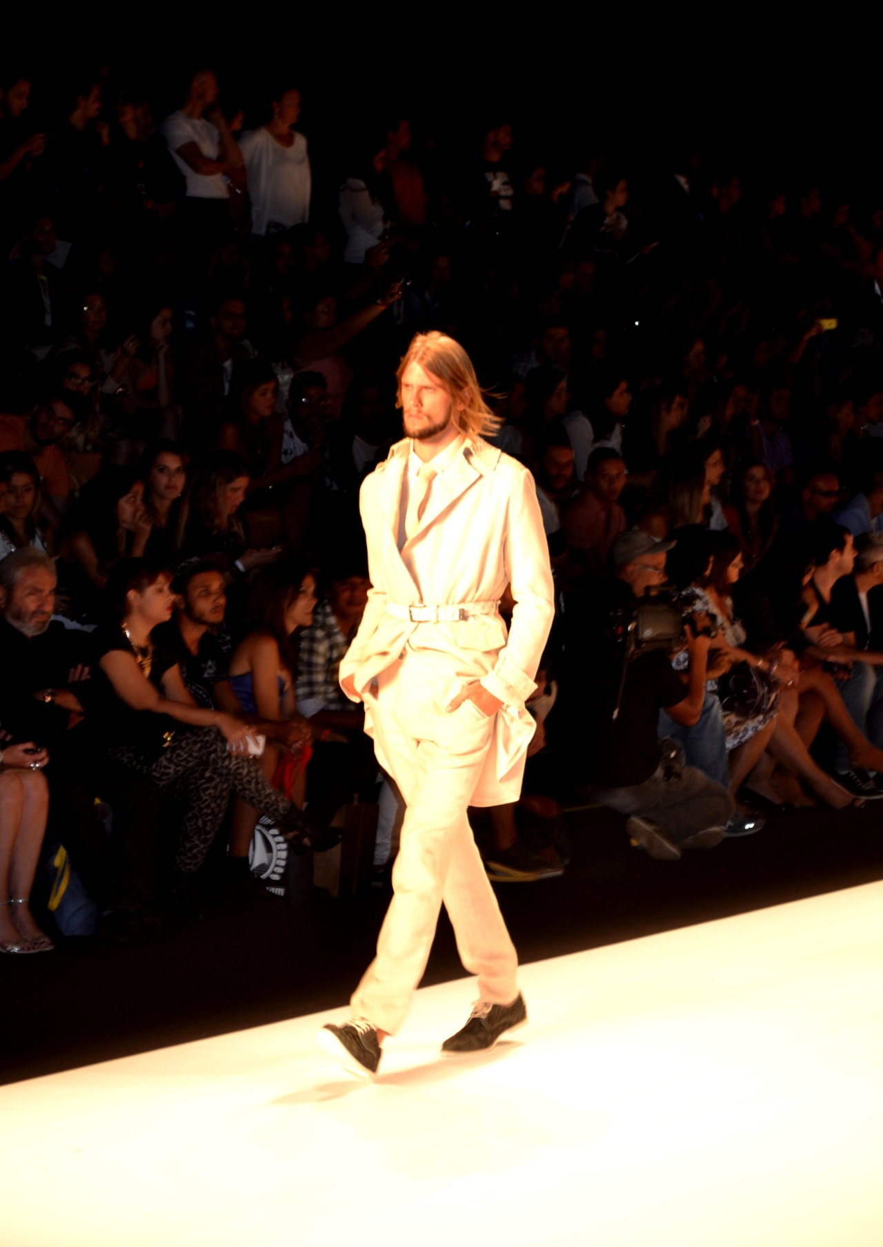 Os homens, no desfile da TNG, que obedeceu ao tema “Botânico”, no Fashion Rio Verão 2014/2015, na Marina da Glória, foram contemplados com este conjunto de trench coat afivelado por um cinto, camisa e gravata, todos num tom off-white, valorizando a elegância da alfaiataria e sua posição na estação em voga, que foi completo por mocassins escuros.