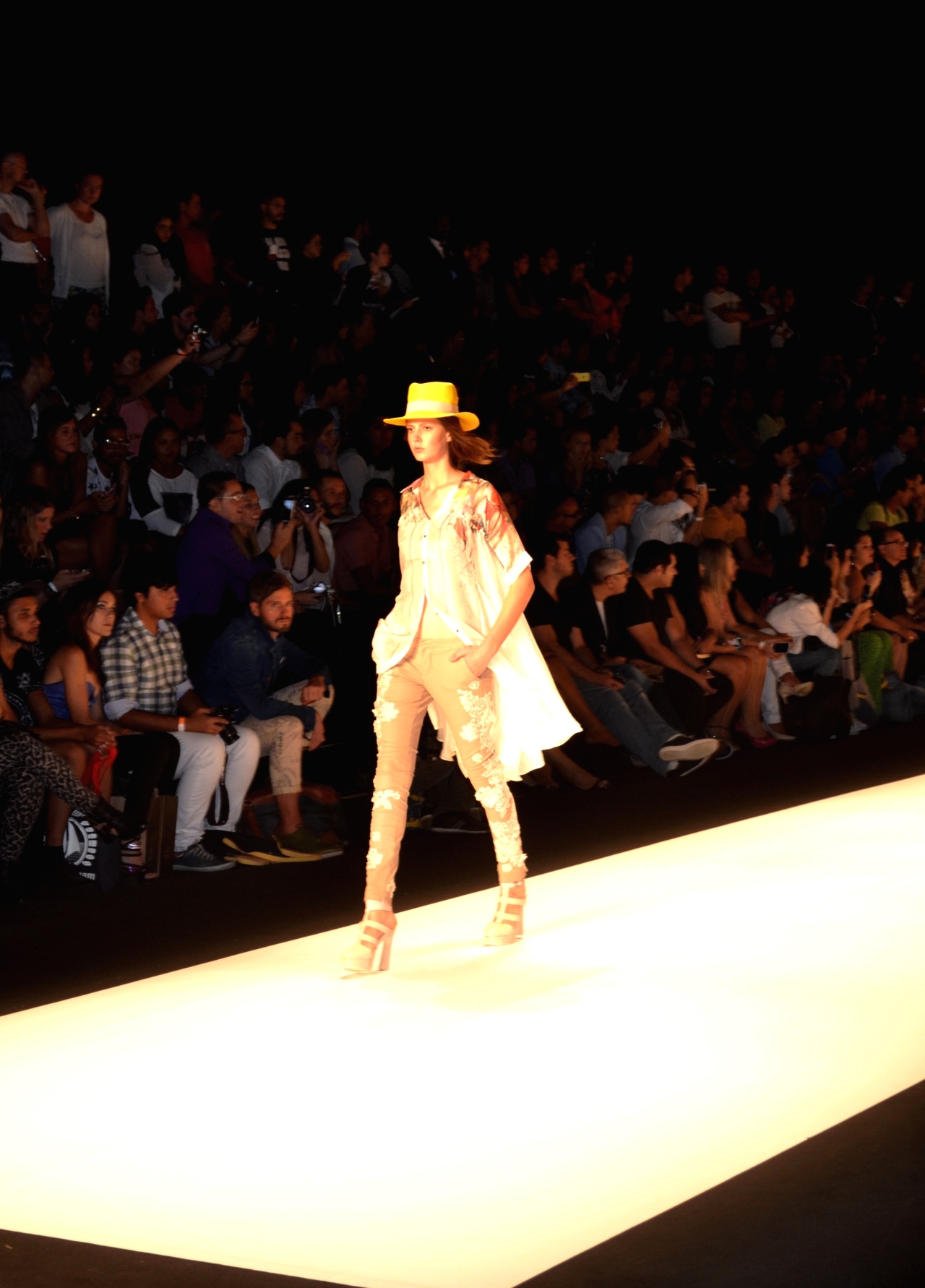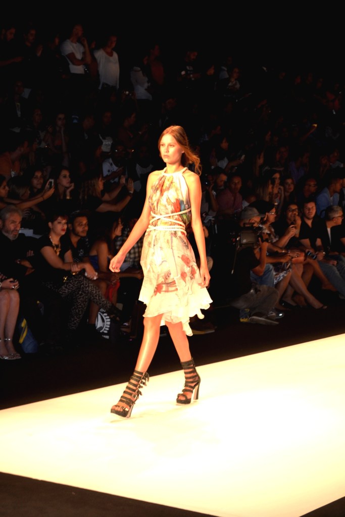 A TNG, na sua coleção para o Verão 2014/2015, mostrada no Fashion Rio, ocorrido na Marina da Glória, apostou nas cores vivas e distintas sobre o branco, em evidência neste vestido frente única fluido e em camadas, floral, amarrado na cintura por cordas, uma ideia que o diferencia dos demais. Novamente, as sandálias gladiadoras fazem parte da composição.