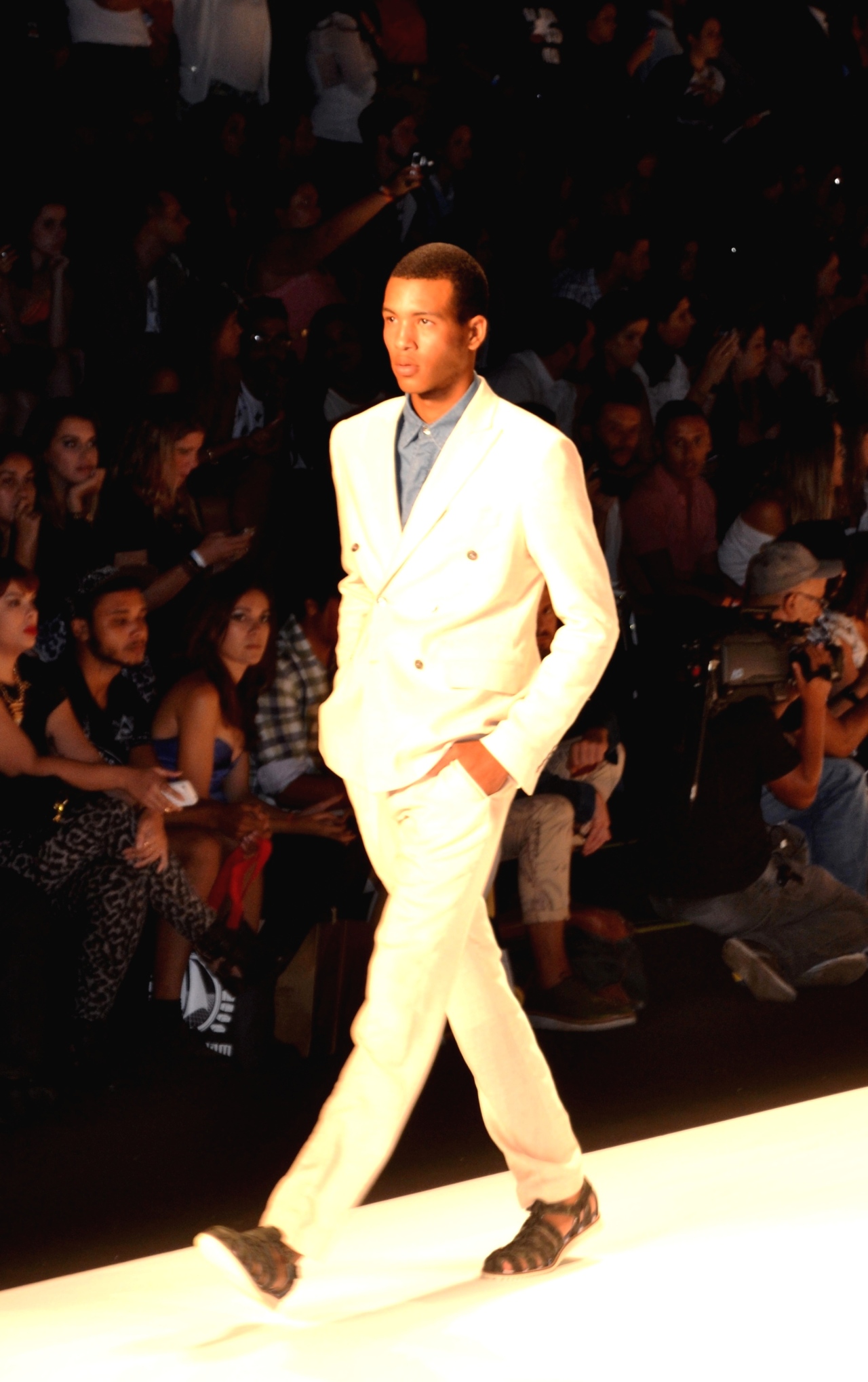 A TNG, em sua coleção “Botânico”, preparada exclusivamente para a temporada Verão 2014/2015 do Fashion Rio, na Marina da Glória, reservou para os homens este conjunto de blazer transpassado com quatro botões e calça cremes, que se complementam com uma camisa jeans e sandálias vazadas num tom mais escuro. Percebemos que a marca investe na alfaiataria num contexto mais informal e despojado.
