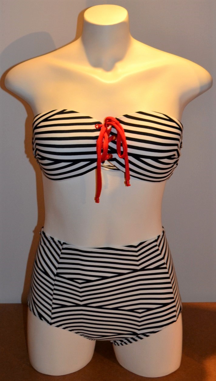A moda praia navy está representada por este biquíni (que se utiliza de hot pants) na exposição do Coletivo Rio (30 marcas fluminenses, com o apoio da FIRJAN, Federação das Indústrias do Estado do Rio de Janeiro, puderam mostrar peças de suas coleções, com roupas para a noite e o dia, além dos acessórios apropriados para a estação de verão, na edição 2014/2015 do Fashion Rio, promovida na Marina da Glória).