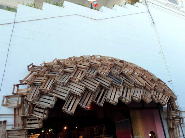 Entrada de um dos espaços dedicados aos estandes, com decoração feita com caixotes de madeira, na feira de moda Babilônia Feira Hype, Jockey Club Brasileiro, Jardim Botânico, RJ.