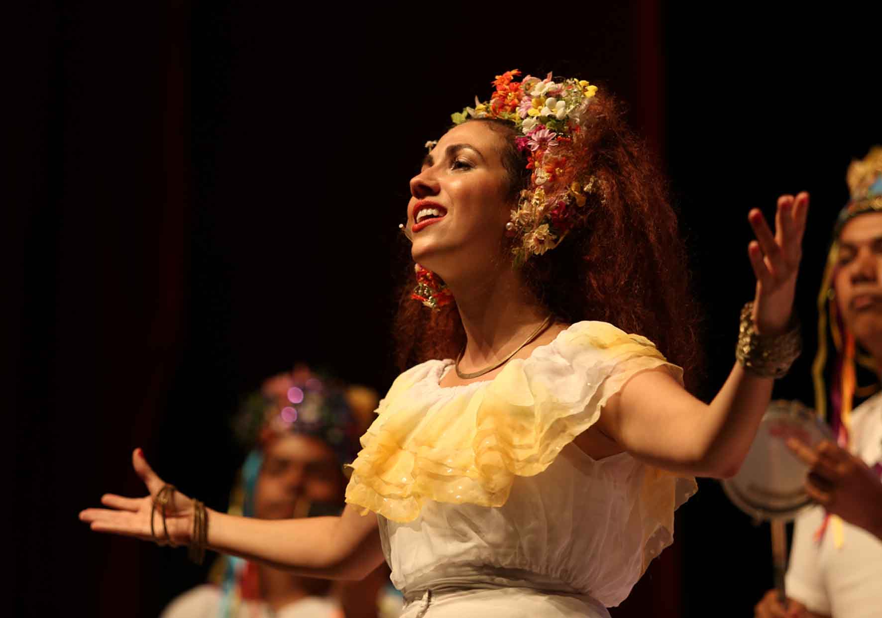 Na década de 70 e início da de 80, o Brasil se encantava com uma bonita mulher morena que ostentava lindamente seus cabelos volumosos (não negando a sua ancestralidade) presos a tiaras floridas e coloridas, com um gingado envolvente, um sorriso cativante, pés descalços no chão, vestidos brancos que remetiam às baianas de Salvador, e uma voz com inacreditáveis potência, afinação e maviosidade. Seu nome era Clara Francisca Gonçalves Pinheiro ou simplesmente Clara Nunes. Numa época em que significativos representantes da Música Popular Brasileira e suas vertentes são retratados nos palcos e cinema, seria no mínimo injusto que não fosse prestada uma homenagem contextualizada em narrativa teatral a uma de nossas melhores e mais talentosas e originais intérpretes. O espetáculo musical “Deixa Clarear”, pensado poética e idilicamente por Marcia Zanelatto não faz tão somente um desenho biográfico esquemático da trajetória pessoal e profissional da sublime artista. Com extrema sensibilidade, absoluta compreensão da alma de Clara, com a intenção irremovível de perscrutar a sua genuína essência, Marcia construiu com olhos sinceros e emocionados de uma admiradora convicta do valor lapidado de sua personagem real algo como uma epifania musical dramatúrgica. O fio da história não se resume ao caminho supostamente fácil de desfiar os não poucos sucessos da cantora, mas em emoldurar um painel no qual se exponham o limiar da descoberta de um talento, a relação afetuosa com os seus familiares (pai, mãe, irmãos…) e o incentivo destes a soltar a sua “voz de sabiá” na terra das Minas Gerais numa deliciosa ambiência ingênua (as reuniões com os seus parentes lhe serviram como um “palco improvisado”), e o seu seguimento rumo à valorização artística, aquisição de popularidade e estrelato. Conhecemos a Clara de um pequeno Brasil que no futuro desbravaria outros tantos Brasis. A peça assume o deliberado propósito de interagir de modo salutar com os espectadores, seja na comunicação direta por intermédio de pensamentos particulares de Clara Nunes acerca do mundo que a cinge, seja na arrepiante participação do público que acompanha as músicas clássicas de seu cancioneiro, refugiadas na afetividade de nossas memórias coletivas. As palmas da plateia num ritmo compassado também se fazem presentes na sua eloquência, como se fosse uma necessidade indissociável daquela de se integrar, ao menos em parte, da consagração ritualística de uma existência diferenciada de uma artista. O texto, como dito, enleva-nos por sua poesia pura, empatia, palavras coordenadas pela emoção e sonoridade, fraseados cantantes, organizando toda essa gama de elementos num conjunto cênico muito bem alinhavado. Nossas raízes africanas e sua potente e fascinante religiosidade fundada nos orixás são clarificadas na postura devota da protagonista. Umbandista, Clara nos conta histórias ou lendas cujos personagens possuem nomes característicos de sua origem. O espetáculo se mostra imparcial ao abordar o proselitismo religioso de Clara Nunes e o misticismo advindo do mesmo. Com a preciosa contribuição de três excelentes músicos, que se utilizam, em sua maioria, de instrumentos percussivos, assim como os de cordas (violão e cavaquinho), além do chocalho, os grandes sucessos de Clara Nunes que se eternizaram, como “A Deusa dos Orixás”, “O Canto das Três Raças”, “Portela na Avenida”, “Morena de Angola”, “Ê Baiana”, “O Mar Serenou”, “Conto de Areia”, dentre outros, são entoados no contexto da costura narrativa de maneira equilibrada e agradável. Canções mais efusivas e dançantes se alternam com aquelas de melodias suaves e romantizadas. A menção à perda precoce da cantora se dá de forma sutil, reverente e delicada. Não foram preteridas de nosso entendimento as referências culturais regionais arraigadas em nossa rica tradição popular, tais como o maxixe, o congado, o frevo e o jongo. Há o exato instante em que abraçou o samba como o norte de sua carreira, gênero que a tornou célebre em todo o país. A encenação teatral não descarta uma passagem cômica, na qual assume visível despojamento: a apresentação da artista no programa do saudoso comunicador Abelardo Barbosa, o Chacrinha, com seus impagáveis calouros. A proposta edificante do diretor Isaac Bernat, parece-nos, é a de tocar o público, fazê-lo lembrar do quão relevante Clara Nunes era e é para a nossa cultura, e nos provar, por meio de suas belíssimas canções, que o nosso repertório já tivera tempos mais áureos. Não à toa são composições que, mais de trinta anos após a sua morte (“Deixa Clarear” foi montada justamente como celebração e homenagem à data), penetram suavemente em nossos ouvidos, revolvendo as mais íntimas e recônditas emoções. Isaac intencionou ocupar todo o espaço cênico com a vasta expressividade corporal da intérprete, mantendo sempre os três músicos no fundo direito da ribalta (à exceção da cena em que participam, como atores, do programa do Chacrinha). Confere-se uma constante interação entre Clara Santhana e os músicos, seja por olhares seja pelo direcionamento de suas falas. A peça ostenta uma fluência naturalmente prazerosa. A atuação de Clara Santhana merece uma apurada análise. O que se depreende ao testemunharmos esta atriz e cantora no alto de um palco é o florescer fulgurante de sua ímpar capacidade interpretativa. Não se trata tão somente de um trabalho de composição, mas de uma absorção sensorial, emotiva, transcendente das características e atributos que definiriam Clara Nunes como a conhecemos. Clara Santhana se conecta com a sua natural beleza a também bela Clara Nunes, por meio de uma força acima do real para nos encantar, e até mesmo, no melhor dos sentidos, enfeitiçar o público. Sua voz é tão potente quanto suave, atingindo uma extensa gama de tons. Límpida, afi