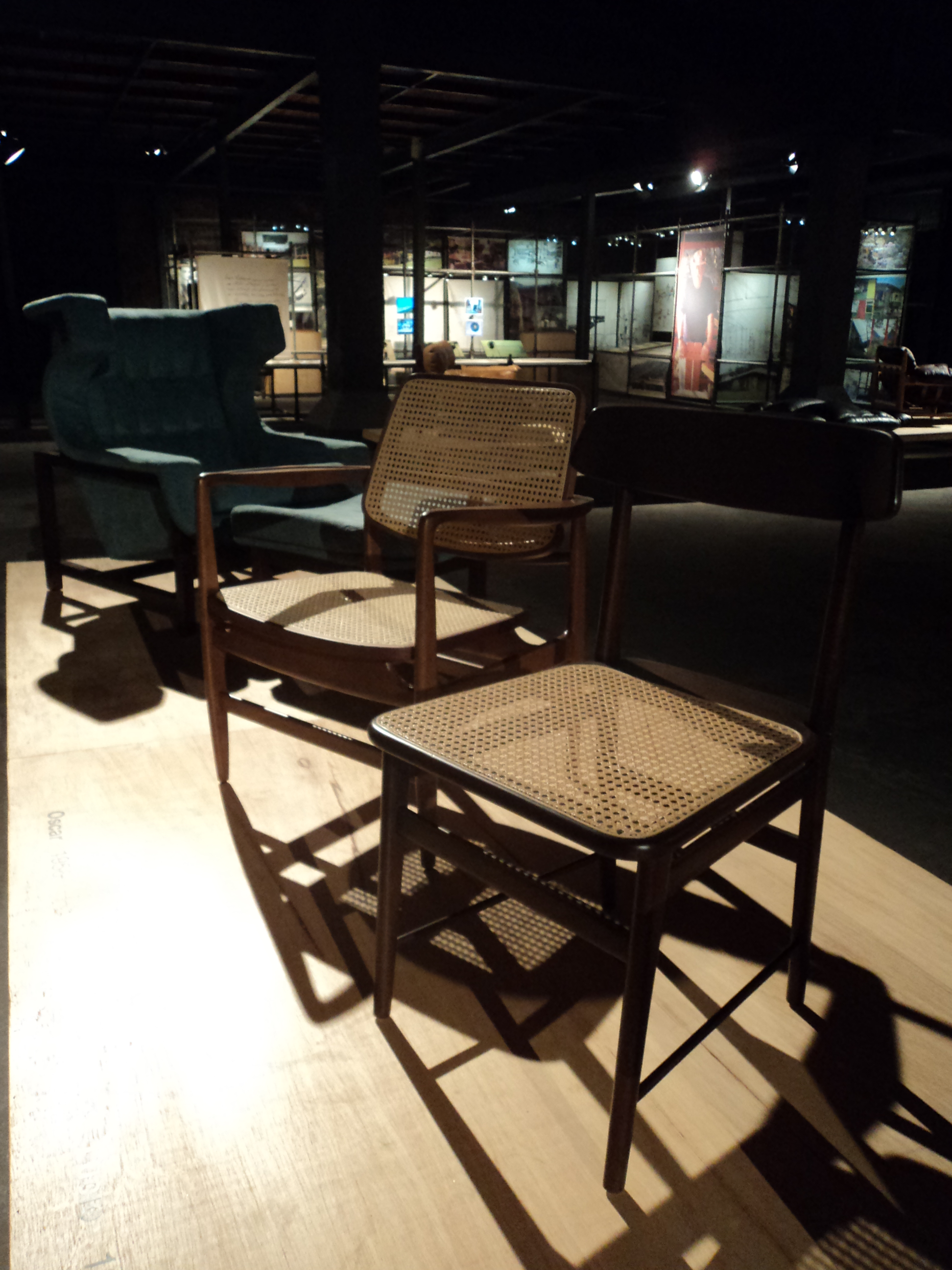 Cadeiras Oscar (1956) e poltrona Voltaire (1965) ao fundo desenhadas pelo arquiteto e designer brasileiro Sergio Rodrigues, em exposição na mostra a ele dedicada no Fashion Rio Outono Inverno 2012, que aconteceu no Píer Mauá.